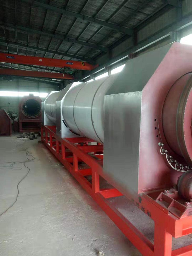 我們解決其技術(shù)問題所采用的技術(shù)方案是:一種新型環(huán)保節(jié)能熱風(fēng)炒爐,由電源供電,包括第一燃燒室、第二燃燒室、熱風(fēng)炒爐滾筒、存料機(jī)、自動(dòng)喂料器、出料機(jī)、引風(fēng)機(jī)和排潮風(fēng)機(jī),所述熱風(fēng)炒爐滾筒的入口端通過自動(dòng)喂料器與所述存料斗連通,所述熱風(fēng)炒爐滾筒的入口端還通過風(fēng)道與所述排潮風(fēng)機(jī)連通,所述熱風(fēng)炒爐滾筒的出口端與出料機(jī)連通,所述第一燃燒室和第二燃燒室通過風(fēng)道與引風(fēng)機(jī)連通,所述第一燃燒室和第二燃燒室分別位于所述熱風(fēng)炒爐滾筒的下方,所述熱風(fēng)炒爐滾筒軸心線與水平面形成2°到8°的夾角,所述第一燃燒器和第二燃燒器安裝位置在相應(yīng)燃燒室的前端或者相應(yīng)燃燒室的兩個(gè)側(cè)面。我們?cè)O(shè)備取消了原熱風(fēng)炒爐所配套的單獨(dú)熱風(fēng)爐、彎段風(fēng)道或直段風(fēng)道;在炒爐滾筒下方設(shè)計(jì)安裝兩份熱風(fēng)燃燒室,用燃燒器產(chǎn)生的熱風(fēng)直接對(duì)滾筒進(jìn)行加熱,最大限度地縮減了炒爐散熱環(huán)節(jié)和面積,從而實(shí)現(xiàn)炒爐連段式加熱。與現(xiàn)有設(shè)備相比,我們公司設(shè)備充分利用了熱風(fēng)釋放的熱量,減少了熱量損失,單噸油料或糧食加工消耗添人氣甚至能降低到25nm3,降低了17%,節(jié)能降耗效果非常明顯,得到了客戶的一致好評(píng)。與現(xiàn)有設(shè)備相比,同等日加工量,所配兩臺(tái)燃燒器合計(jì)功率比現(xiàn)有設(shè)備燃燒器功率下降20%-30%,熱風(fēng)設(shè)定溫度有750-800℃下降到400-500℃,明顯延長了炒爐的使用壽命。第一燃燒室和第二燃燒室的功能各不相同,工作溫度也不一致,第一燃燒室和第二燃燒室能夠?qū)崿F(xiàn)分段加熱溫度控制,更加靈活與合理,安全可靠,便于操作與控制。